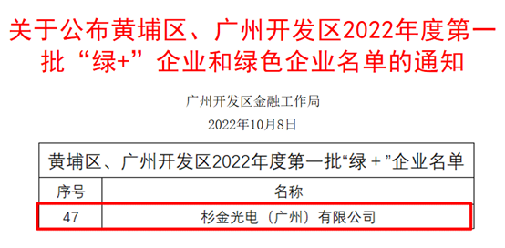 近日,根據《關于印發廣州市黃埔區 廣州開發區綠色項目、綠色企業認定管理辦法(試行)的通知》(穗開金融規字〔20204號)文件要求,經企業申報,第三方認證機構評審、認定,廣州開發區金融工作局受理、審查、公示等程序,杉金廣州成功入選黃埔區、廣州開發區2022年度第一批+”企業。